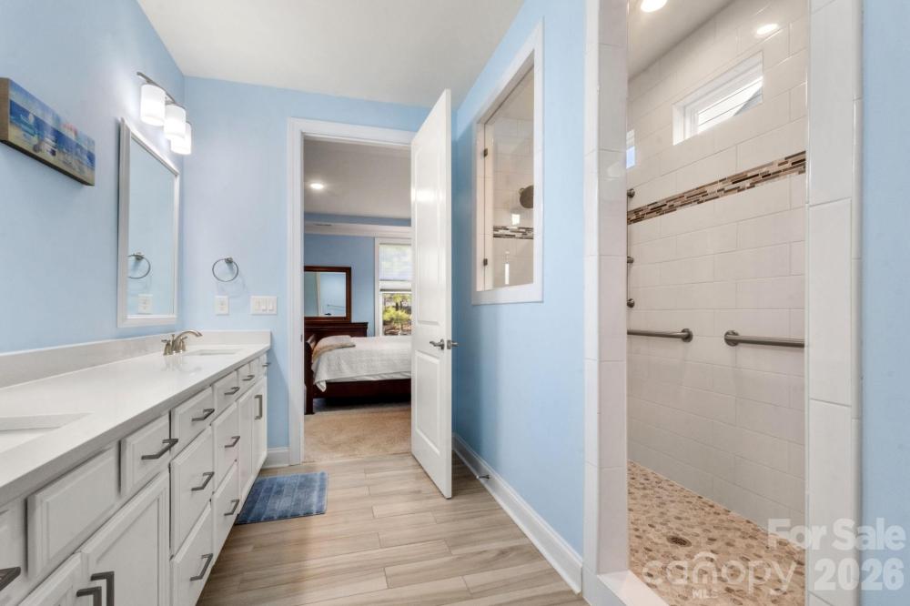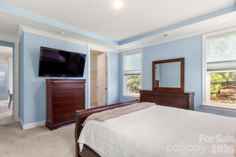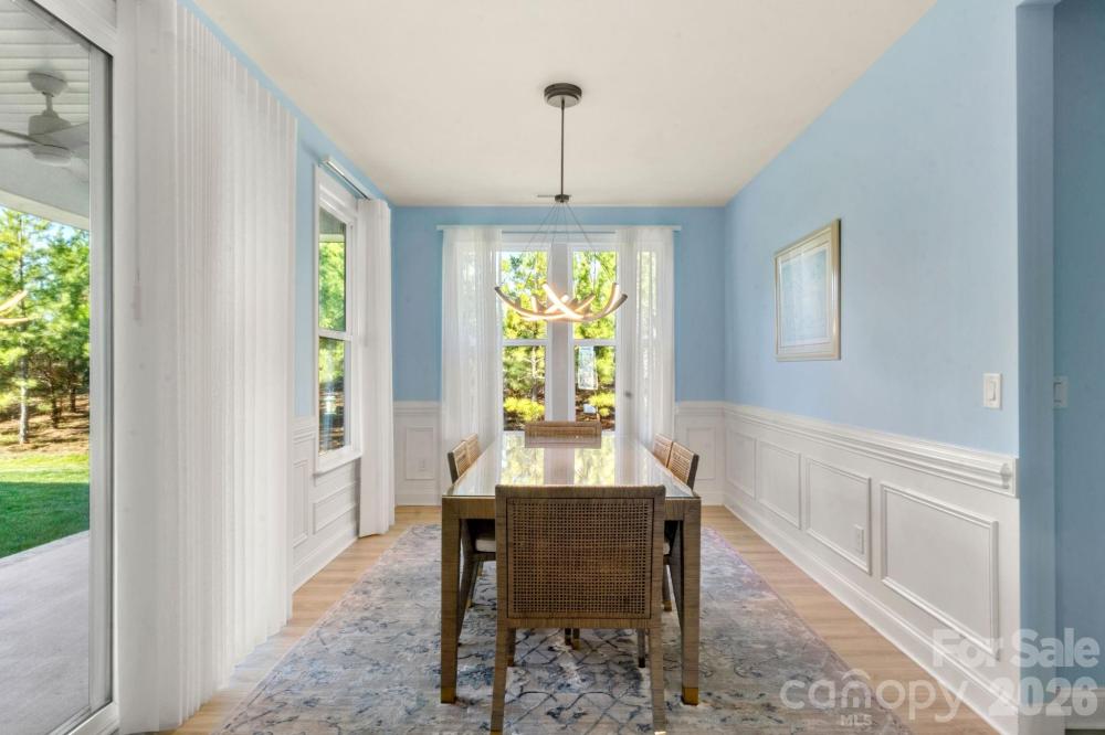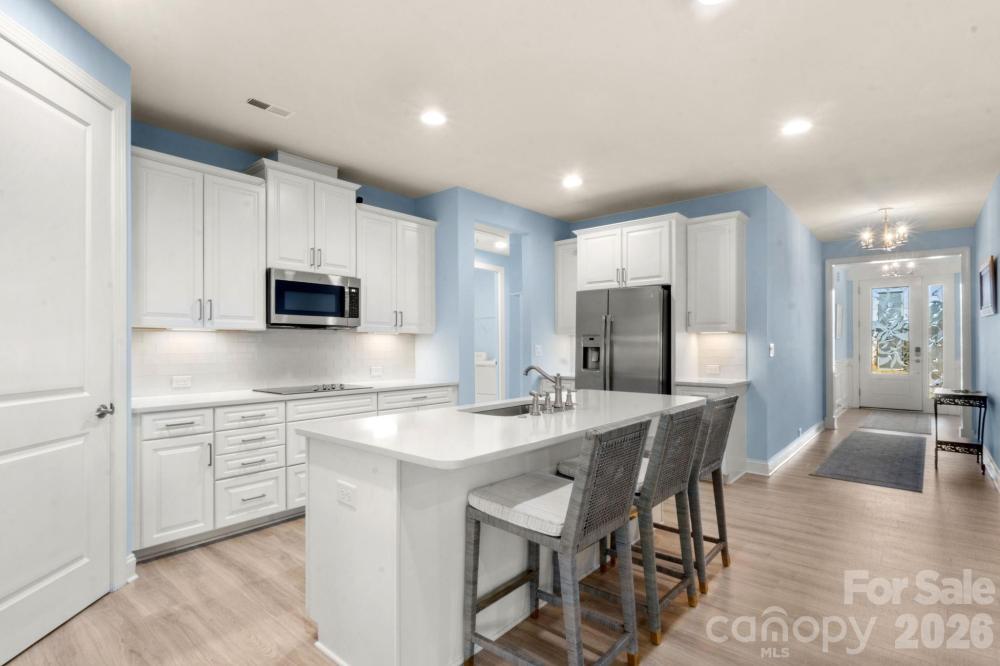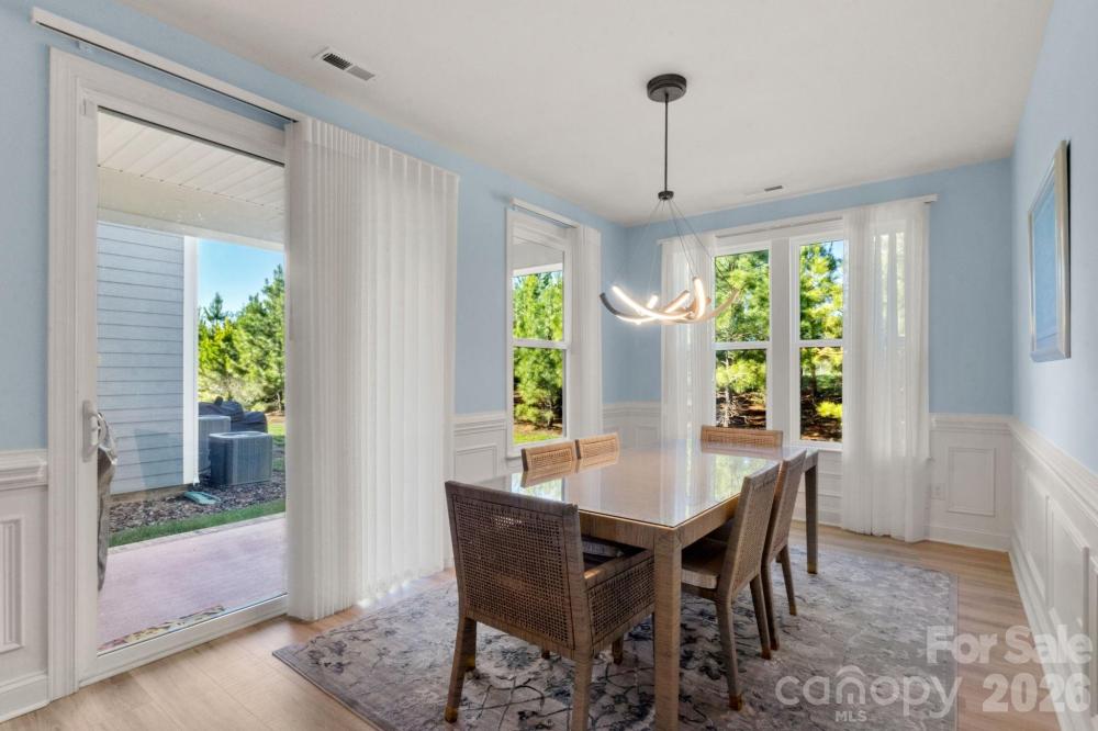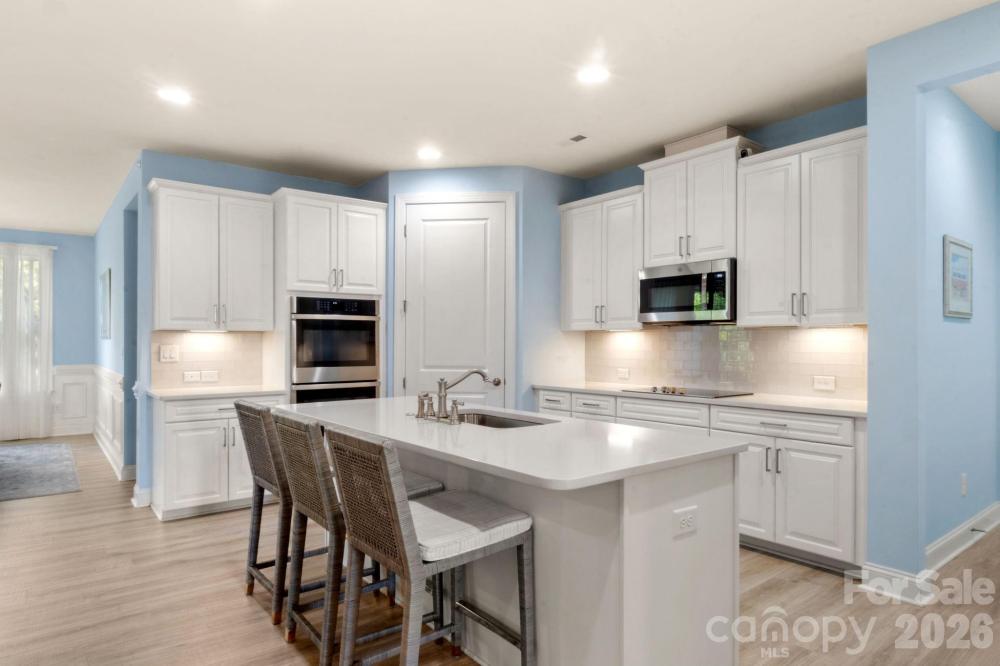 Welcome to your meticulously maintained ranch-style home in the highly sought-after community of Bonterra. Built in 2020 and ideally situated along the peaceful, tree-lined edge of the neighborhood, this home offers both privacy and charm with warm, inviting finishes throughout. From the moment you step inside, you’ll appreciate the soaring ceilings, abundant natural light, and elegant moldings that add character and sophistication. The custom front door, designer window coverings, light luxury vinyl plank flooring, and tall baseboards highlight the thoughtful upgrades that set this home apart. The pristine kitchen is truly the heart of the home, featuring beautiful white cabinetry and countertops, stainless steel appliances, and double wall ovens that still shine like new. A spacious corner pantry provides ample storage, while the large kitchen island seamlessly connects to the open-concept living and dining areas—perfect for entertaining or everyday living. Gather in the inviting living room around the cozy gas fireplace or enjoy meals in the bright dining area overlooking the backyard. The spacious primary suite offers a relaxing retreat with windows that frame views of the private backyard and a generous walk-in closet. The bright primary bathroom features a large walk-in shower, double vanity, separate water closet, convenient linen storage. It also features a comfort-height toilet and stainless steel safety grab bars, providing added support and ease of movement. Two additional spacious bedrooms and a full bath are thoughtfully positioned at the front of the home, offering privacy for guests or family members. A large laundry room and functional drop zone are conveniently located just off the over-sized two-car garage with workshop area, adding everyday practicality. Step outside to the covered patio, accessed directly from the dining area, where you can grill with the included natural gas grill or unwind while watching birds in the trees behind the home. The backyard is designed for easy maintenance and includes an irrigation system to keep the landscaping looking its best. Living in Bonterra means enjoying an active community filled with amenities for all ages, including resort-style pool, tennis courts, a fitness center, playgrounds and athletic fields, and scenic walking trails. The neighborhood mailbox is conveniently located directly across the street from the home. As an added bonus, the refrigerator, designer window coverings, patio natural gas grill, and security system all convey with the property. This move-in-ready home perfectly blends comfort, style, and convenience in one of the area’s most desirable communities.
